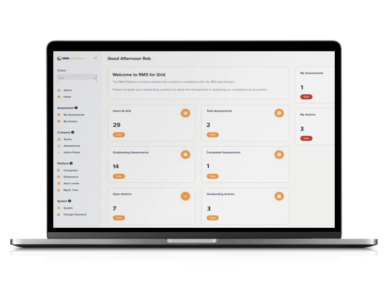 The platform digitises the entire RM3 process — from assessment deployment and response collection to action tracking and performance reporting — making it faster, more consistent, and data-driven.